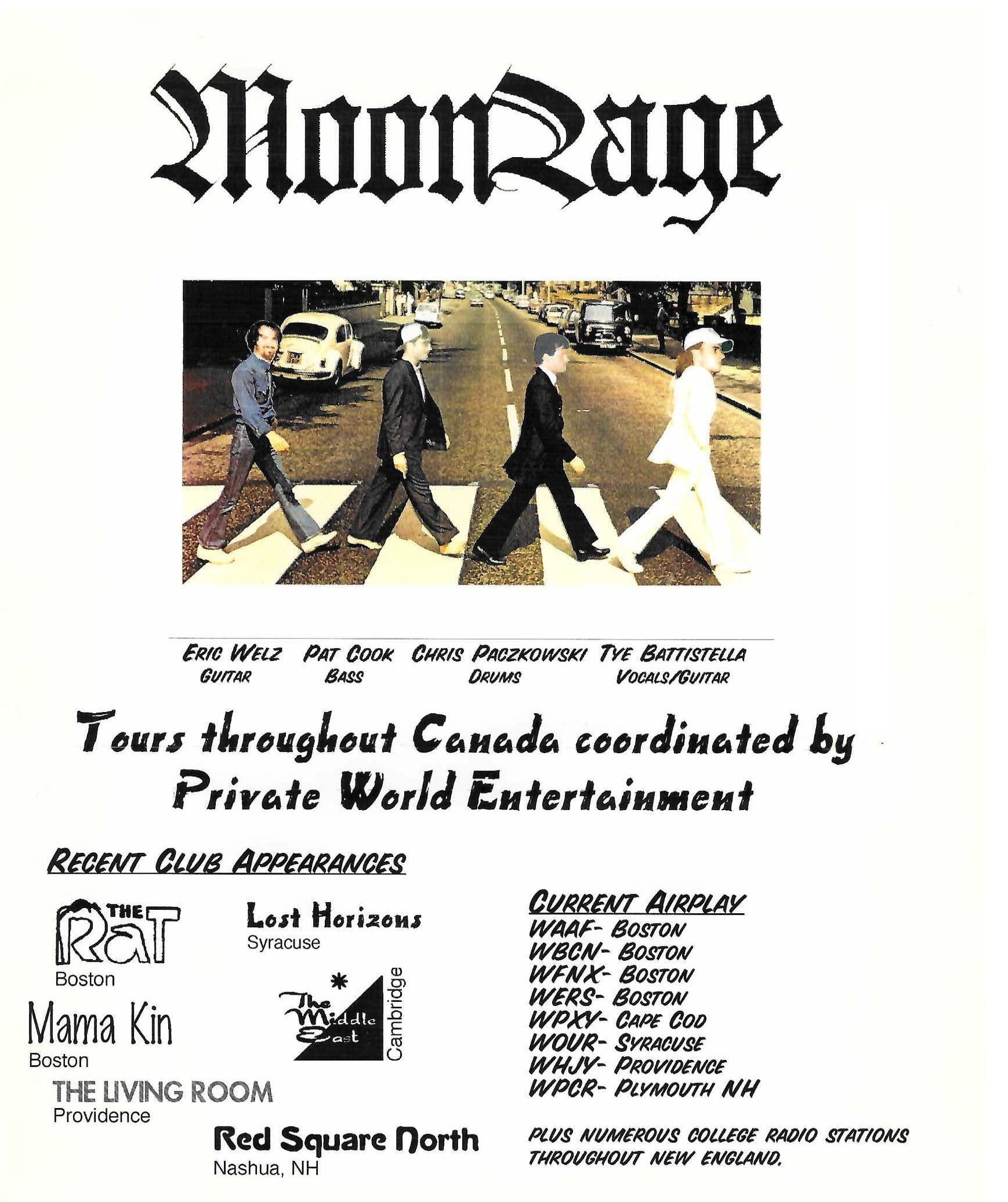 Well, it may not have happened exactly that way, but close enough, In fact, the formation of Moonrage can be called a minor miracle. It was a two year ordeal of bringing together people from upstate New York, Colorado and Connecticut – all with widely diverse musical influence. The resulting music is high energy and driving. Experience Moonrage.